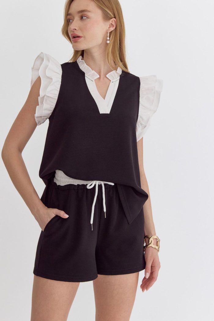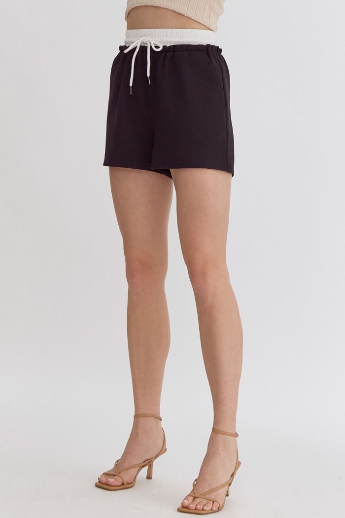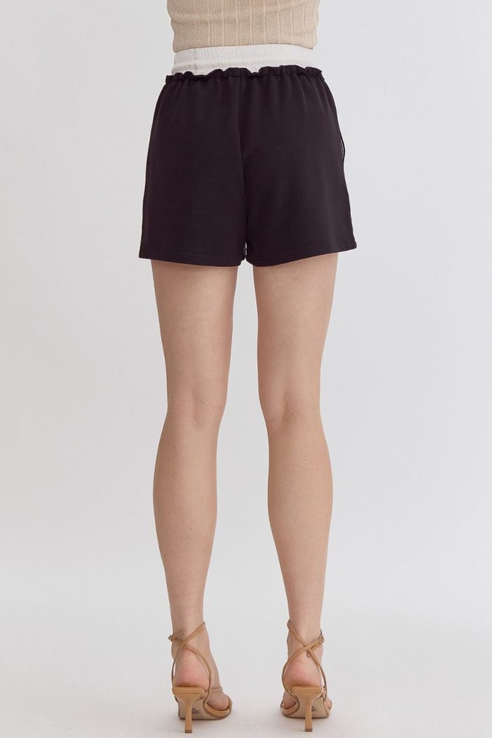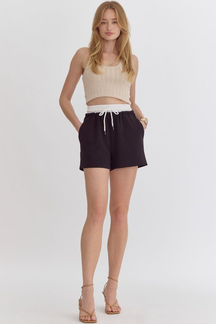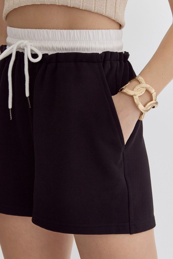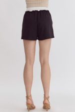 Textured solid high waisted shorts featuring elastic and self tie at waist.